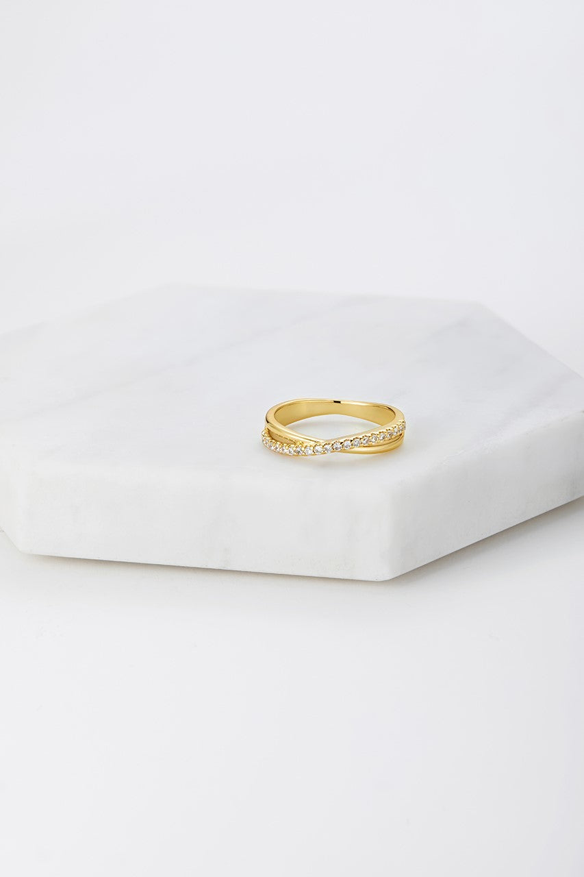 Zafino Florence Ring is a dainty crossover style ring with a little bit if bling. A plain gold plated band joined with a cross over band with a set of tiny crystals. Just gorgeous.