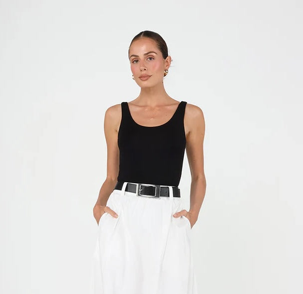A must-have wardrobe staple, this sleek tank features a timeless scoop neck and a streamlined silhouette that effortlessly elevates any outfit. Designed for everyday wear with a refined finish, it pairs perfectly with tailored trousers, denim or layered under jackets for versatile styling.
