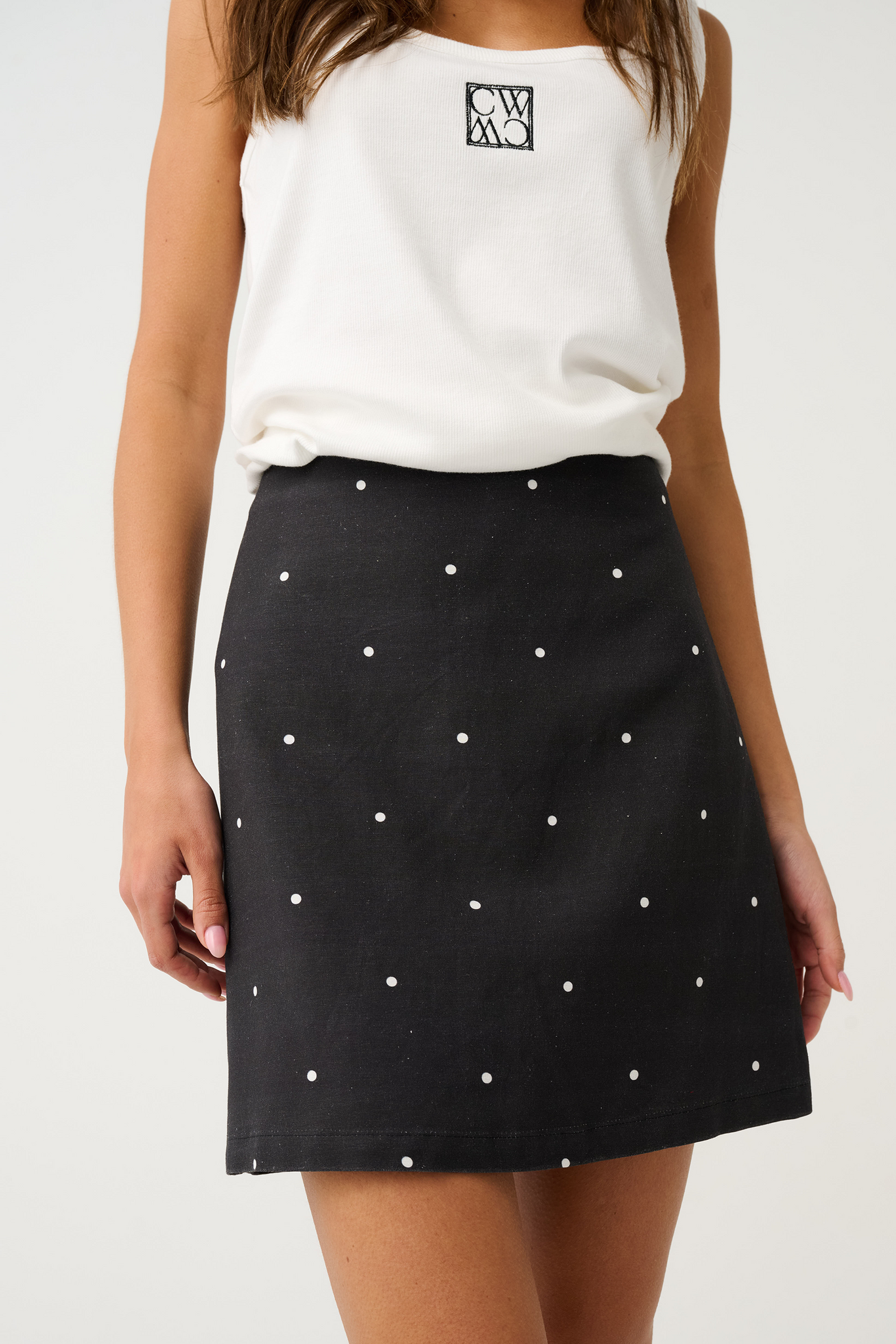 Crafted from a breathable linen and rayon blend and fully lined for a smooth finish, the Zyla Mini Skirt features subtle back waist darts for shaping and an exposed metal zip at the back for a modern edge. The classic black base is elevated with a delicate spot print, making it an easy piece to dress up or down across seasons.