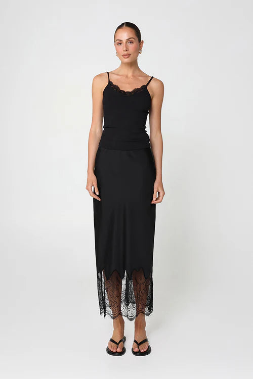 The Maeve Top in Black brings effortless sophistication to your everyday wardrobe. Made from a soft rib fabric and finished with delicate lace along the front neckline, this staple cami is perfect for layering or wearing on its own. With its soft V-neck and thin straps, it’s an essential piece that transitions seamlessly from day to night