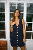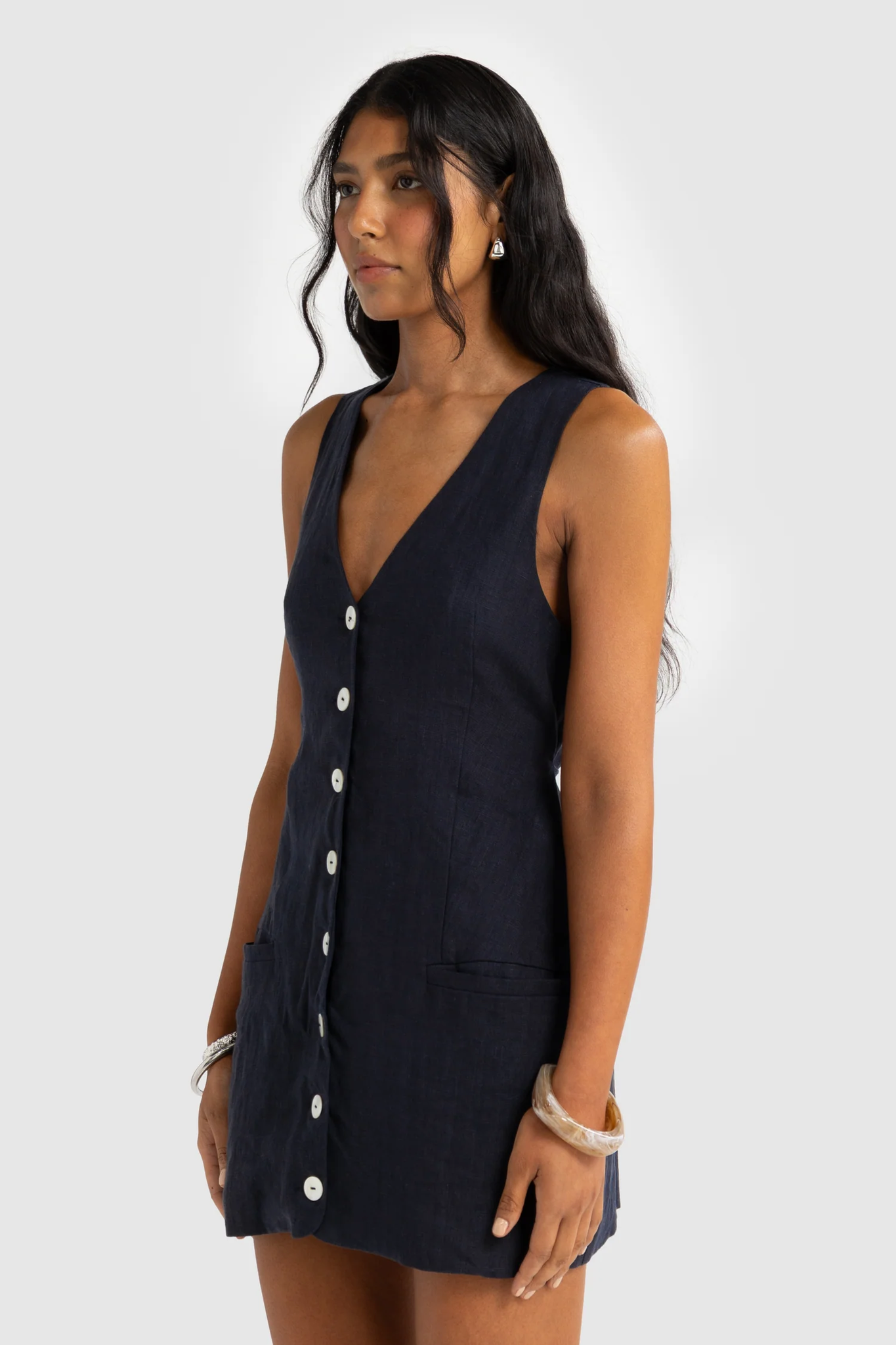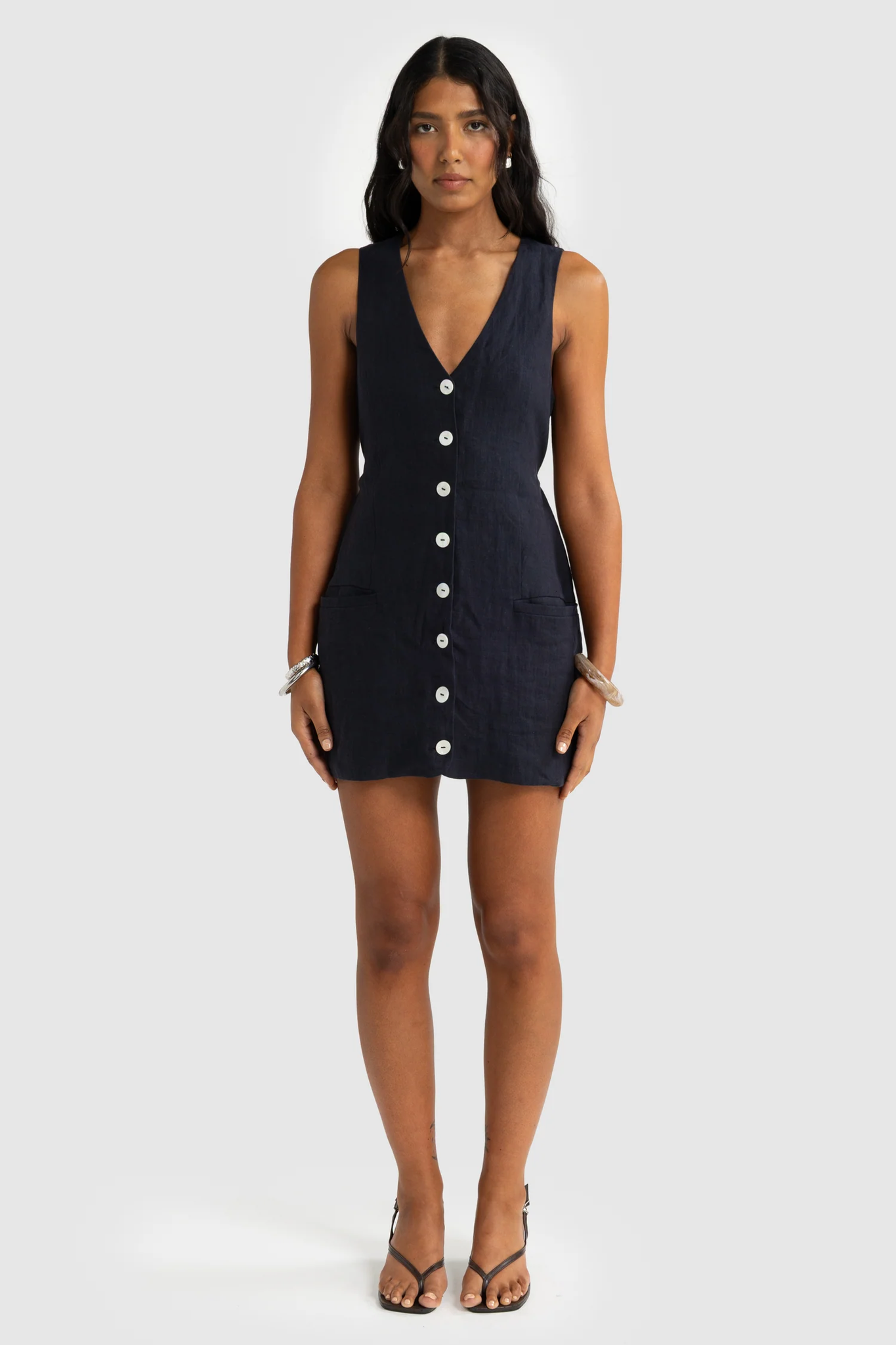 Timeless and effortlessly cool, the Koda Linen Mini is your go-to for warm-weather dressing. Made from 100% linen and fully lined, it features a flattering V-neckline, contrast buttons, and a clean, structured silhouette. A fabric tie at the back lets you cinch the waist for a more tailored fit. Style with heels or sandals for a versatile look.