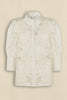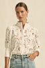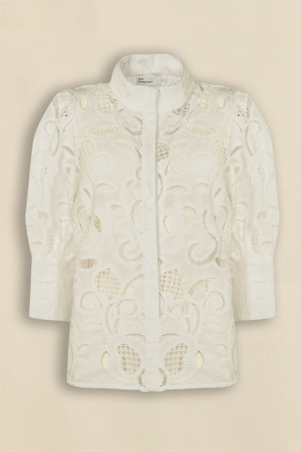 Intricate lace placement on a cotton base introduces delicate detail, while the concealed button placket maintains a clean, refined finish. The romantic, vintage-inspired porcelain hue pairs effortlessly with denim, making it an easy option for both everyday and elevated styling.